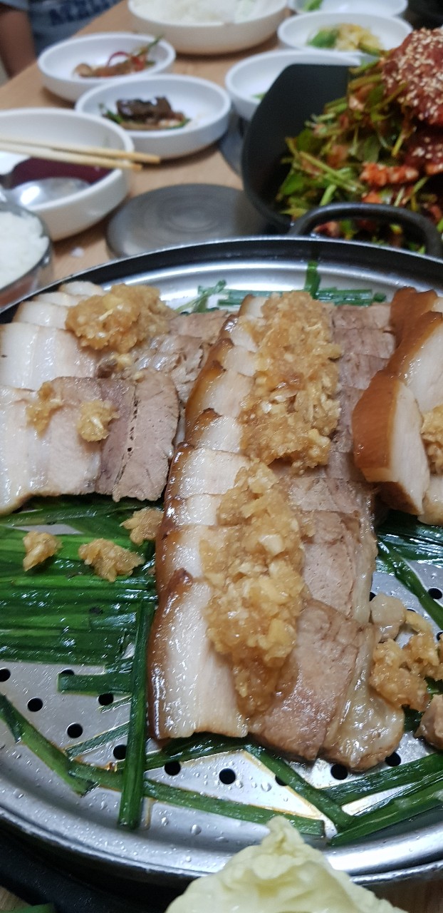 잘 삶아진 보쌈 과 그위에 마늘소스 입니다