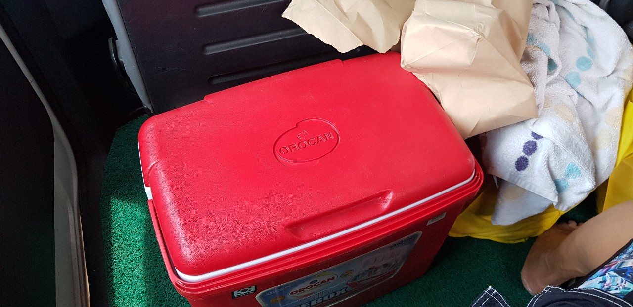 아이스박스 안에는 산미구엘 애플 , 커피 , 포카리스웨트 , 게토레이 , 김밥 , 생수 등이 들어있습니다