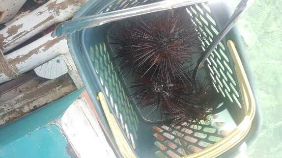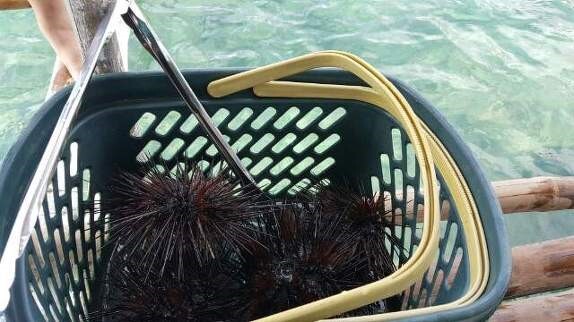 배를 세우고 순식간에 저희가탄 배의 선원들이 천연 비아그라라 불리는 성개를 깨끗한 바다속에서 막 건져 올리네요.