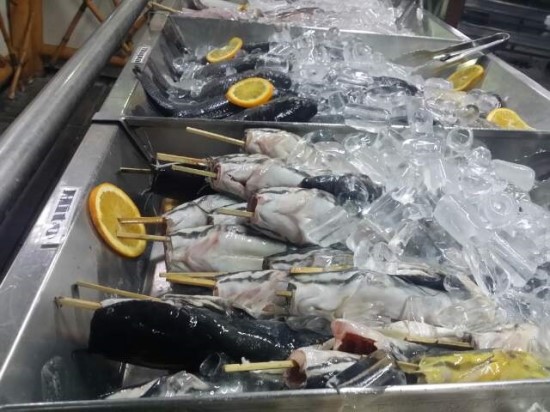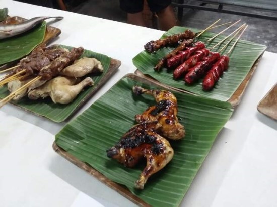 전 주로 돼지고기꼬치 , 닭고기 꼬치 , 새우 그리고 불랄로 라는 필리핀 국 을