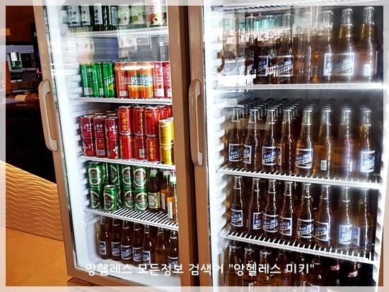레스토랑 음료냉장고 안에는 산미구엘 필센, 산미구엘 라이트, 콜라, 로얄, 스프라이트 외