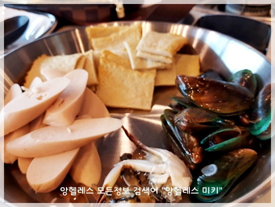 한켠에 해물코너 에는 게, 홍합, 오징어, 어묵, 소세지 등이 마련되어 있습니다.