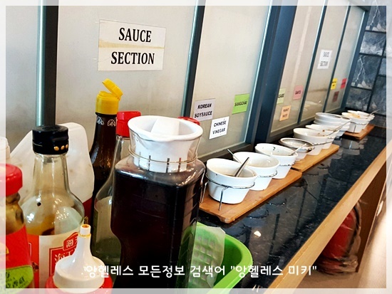간장, 마늘, 땅콩, 겨자, 와사비, 칠리 등등 다양한 소스재료 가 준비되 있으며,