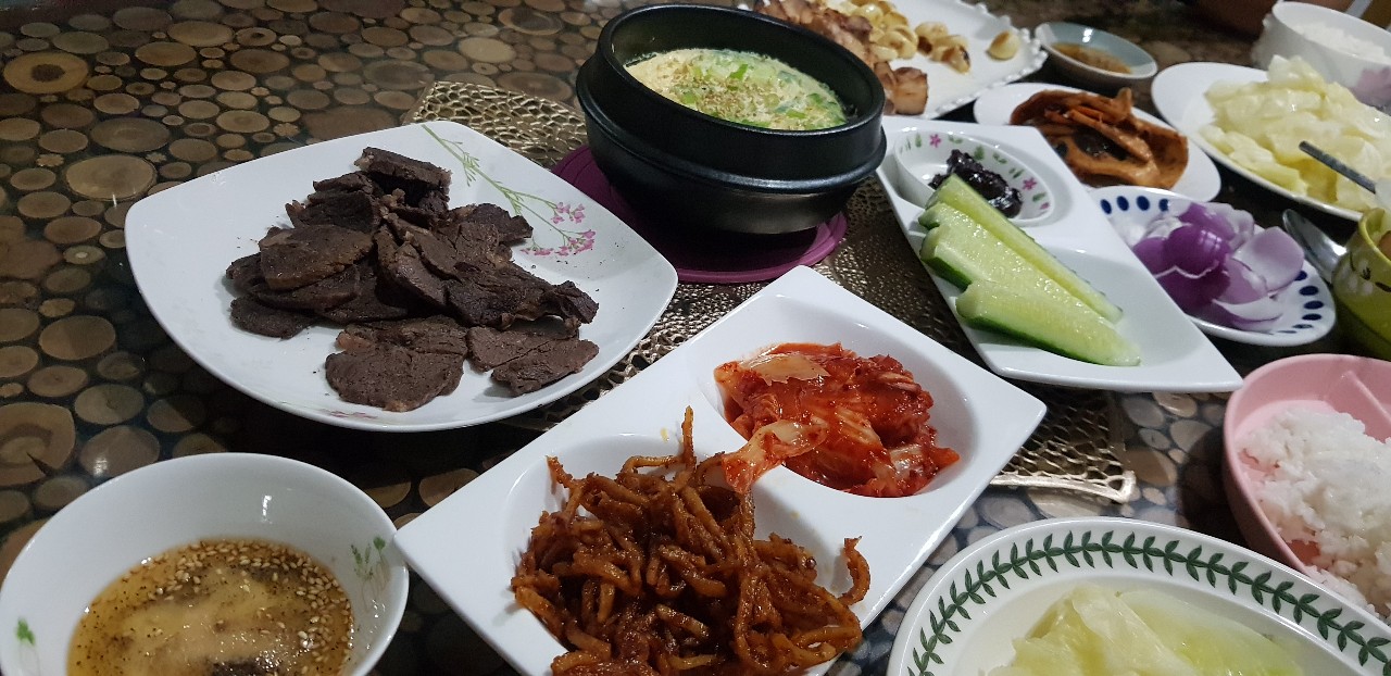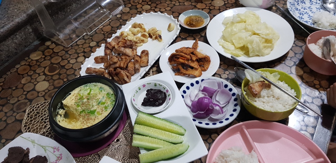 아침조식, 깔라만시, 초코파이, 김치, 삼겹살, 비빔밥 요리가능