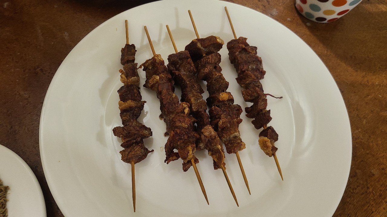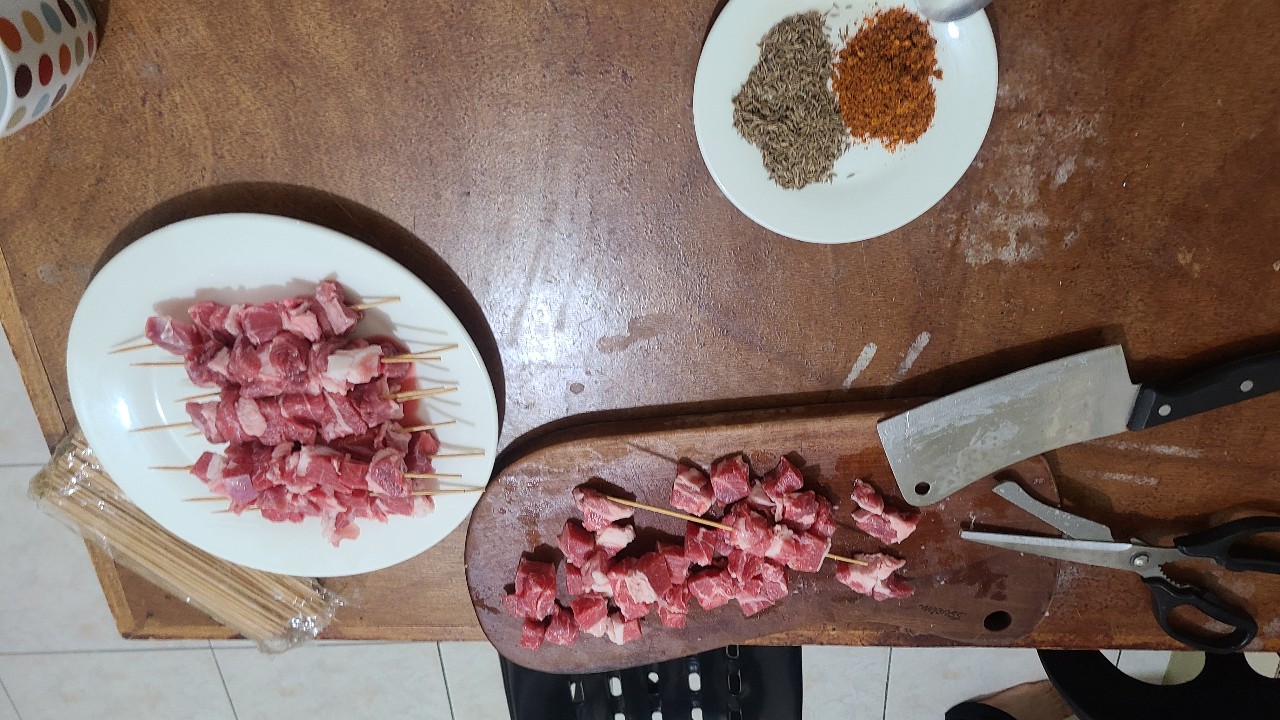 양고기를 깍두기 싸이즈로 잘라서 꼬치에 끼우고 에어프라이어 에 12분 돌리면 된다
