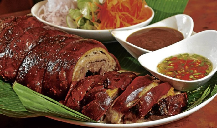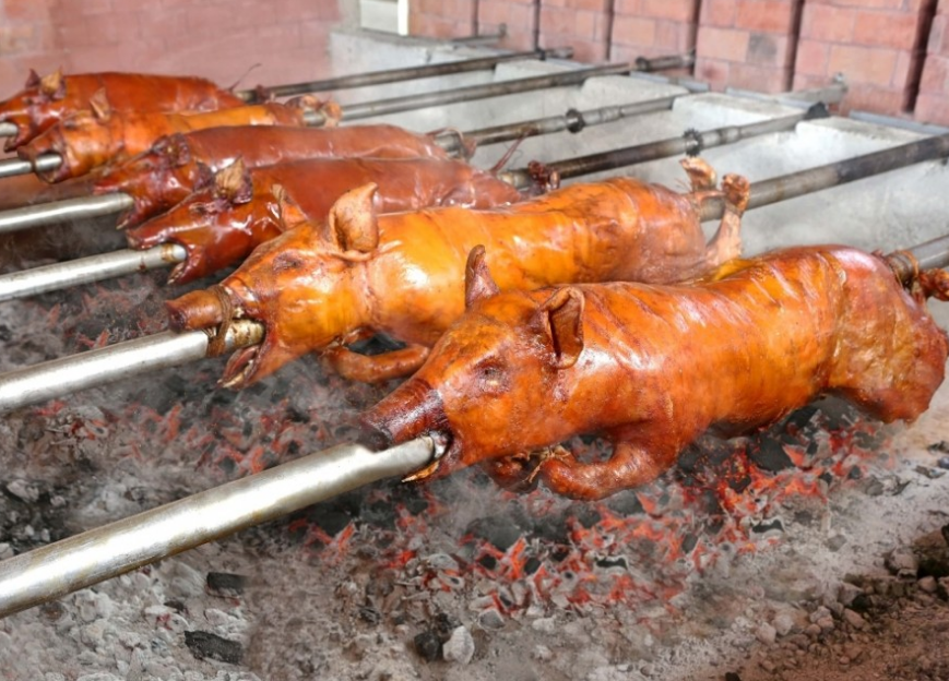 레촌은 숯불로 뜨거운 불에 구운 통돼지입니다.