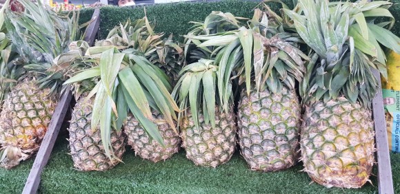 파인애플, 파파야, 바나나, 메론, 수박 등 과일이 진열이 되어 있습니다.