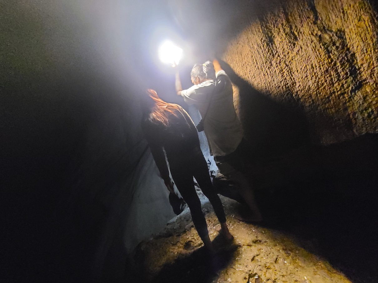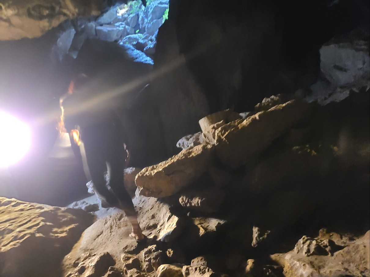 가이드 가 동굴안에서 라이트 를 들고 길을 안내 합니다