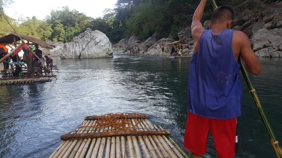 발사 사공이 대나무배를 강줄기를 거슬러올라 원하는 곳에 정박을 시켜 줍니다.