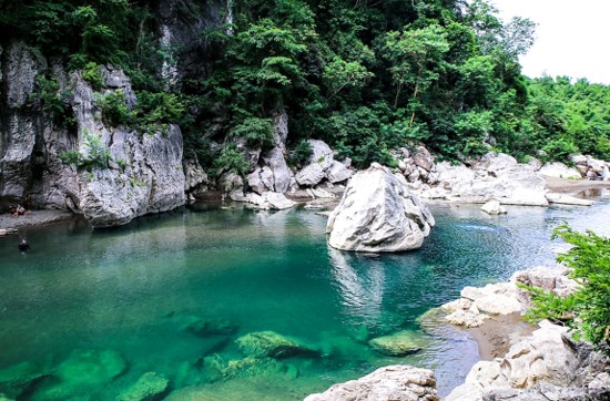 깍아질듯 희귀한 기암괴석 절벽아래 맑은 물이 흐르며 대나무배를 타고 강줄기를 거슬러 오를수 있습니다.