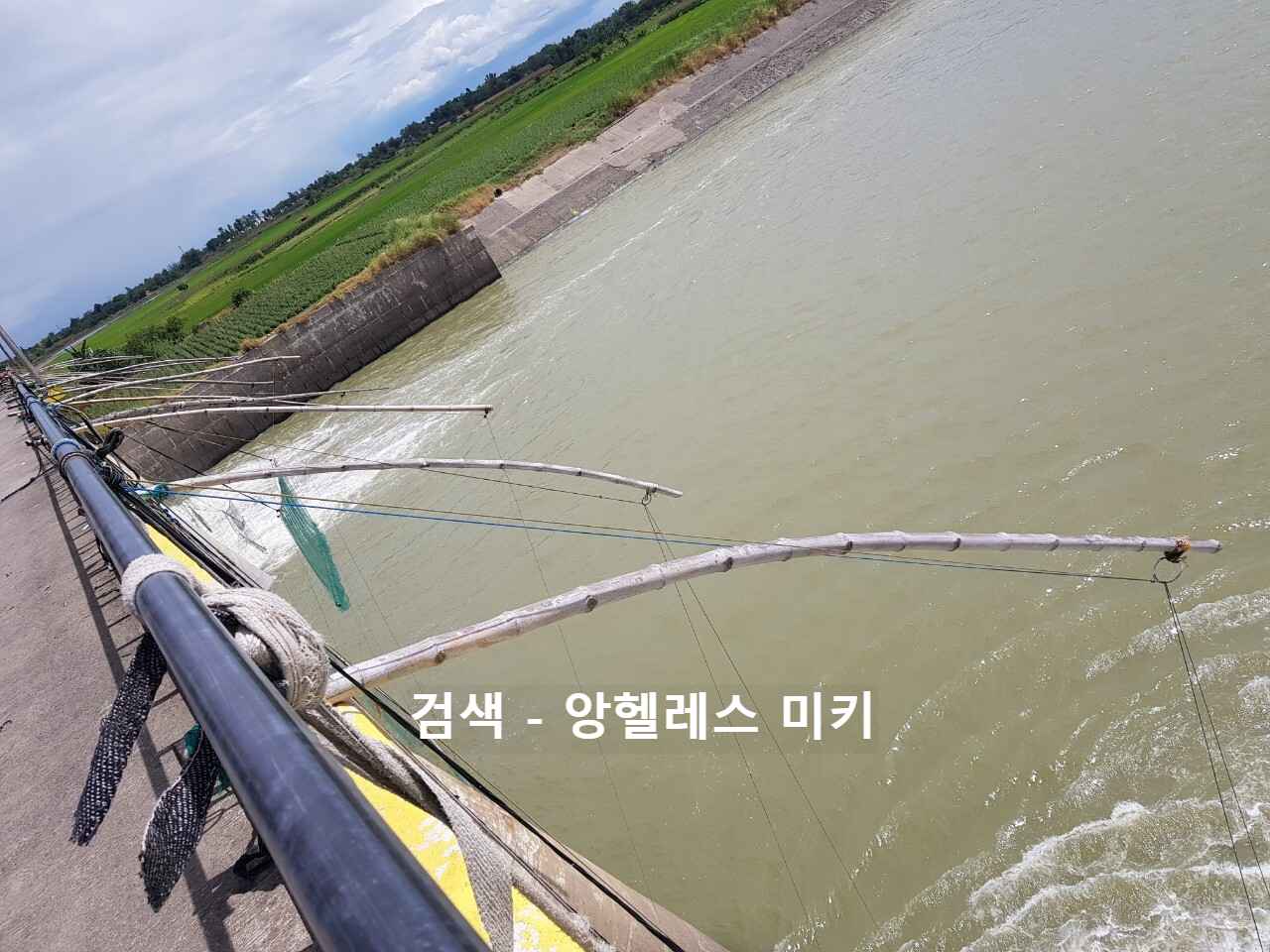 낚시대 나 투망 이 아닌 수문 앞에 그물을 설치해 두고 뛰어오르는 고기가 걸리기를 기다리네요