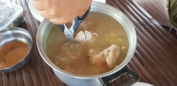 집에서 생강과 1차로 닭을 삶아 오긴 했으나, 현장에서 마늘과 함께 약 1시간 가량 더 삶아질 예정 입니다