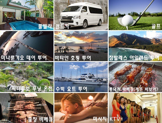 골프부킹, 전용차량, 바타안 해상투어 , 잠발레스 호핑투어 , 미나룬가오 해상투어 , 푸닝온천, atv사발이 , 수빅요트투어 , 실탄사격 , 맛집 , 놀거리