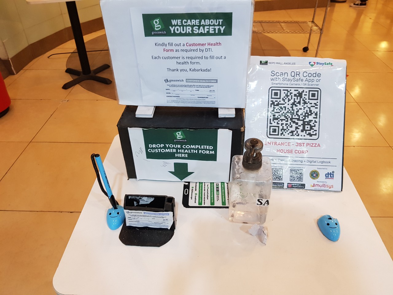 그린위치(green wich) 앙헬레스 맛집 입구에는 알콜, 체온계, 방명록 등이 준비되어 있습니다.