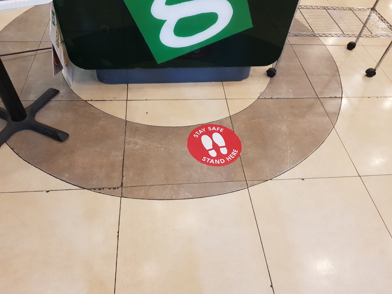 앞뒤 사람간 간격을 유지시키기 위한 발그림 의 스티커 도 바닦에 붙여져 있네요.