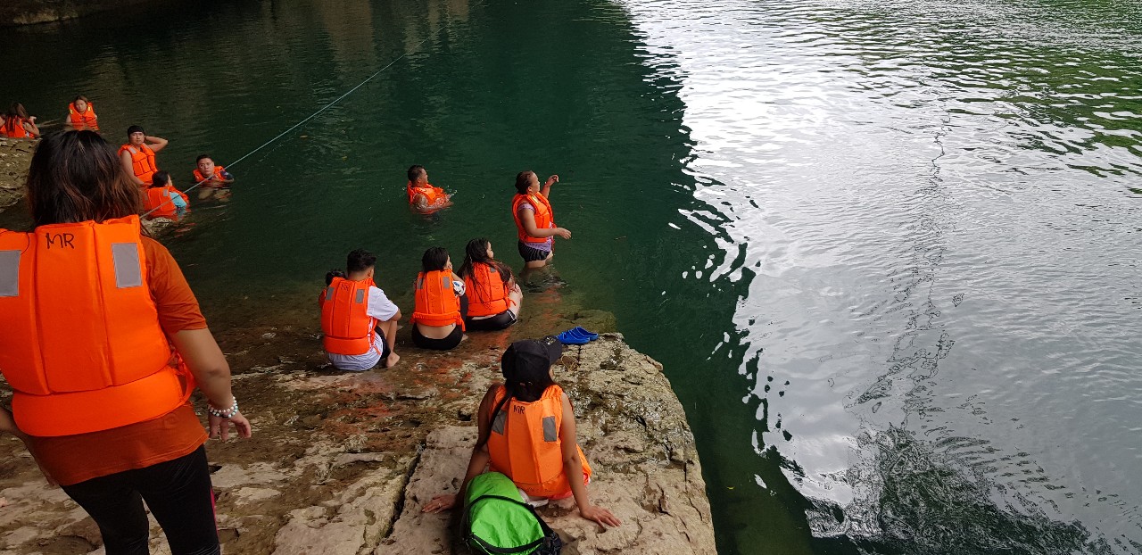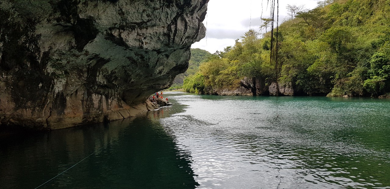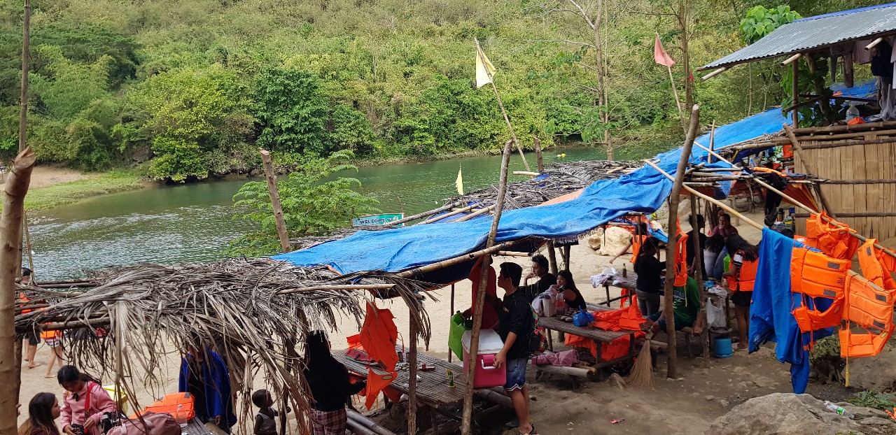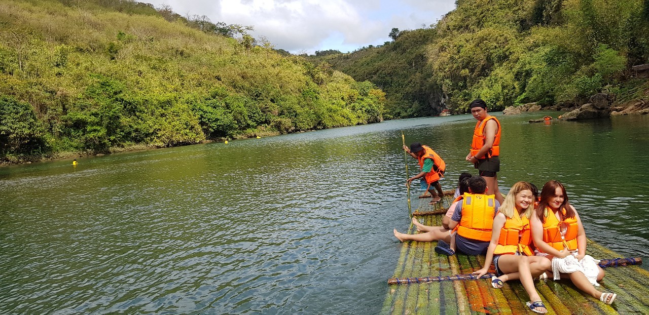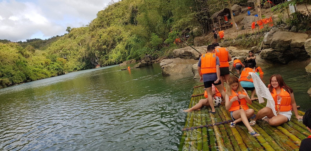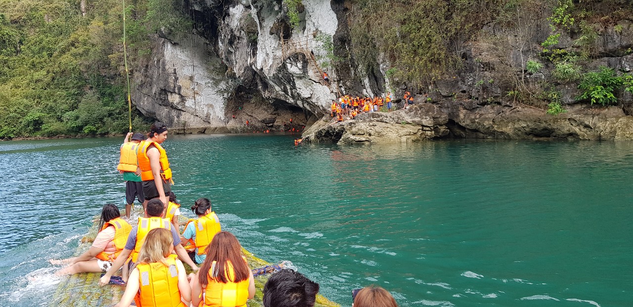 대나무로 만들어진 땟목 일명 "발사" 를 타고 강 상류에 위치한 동굴을 둘러봅니다