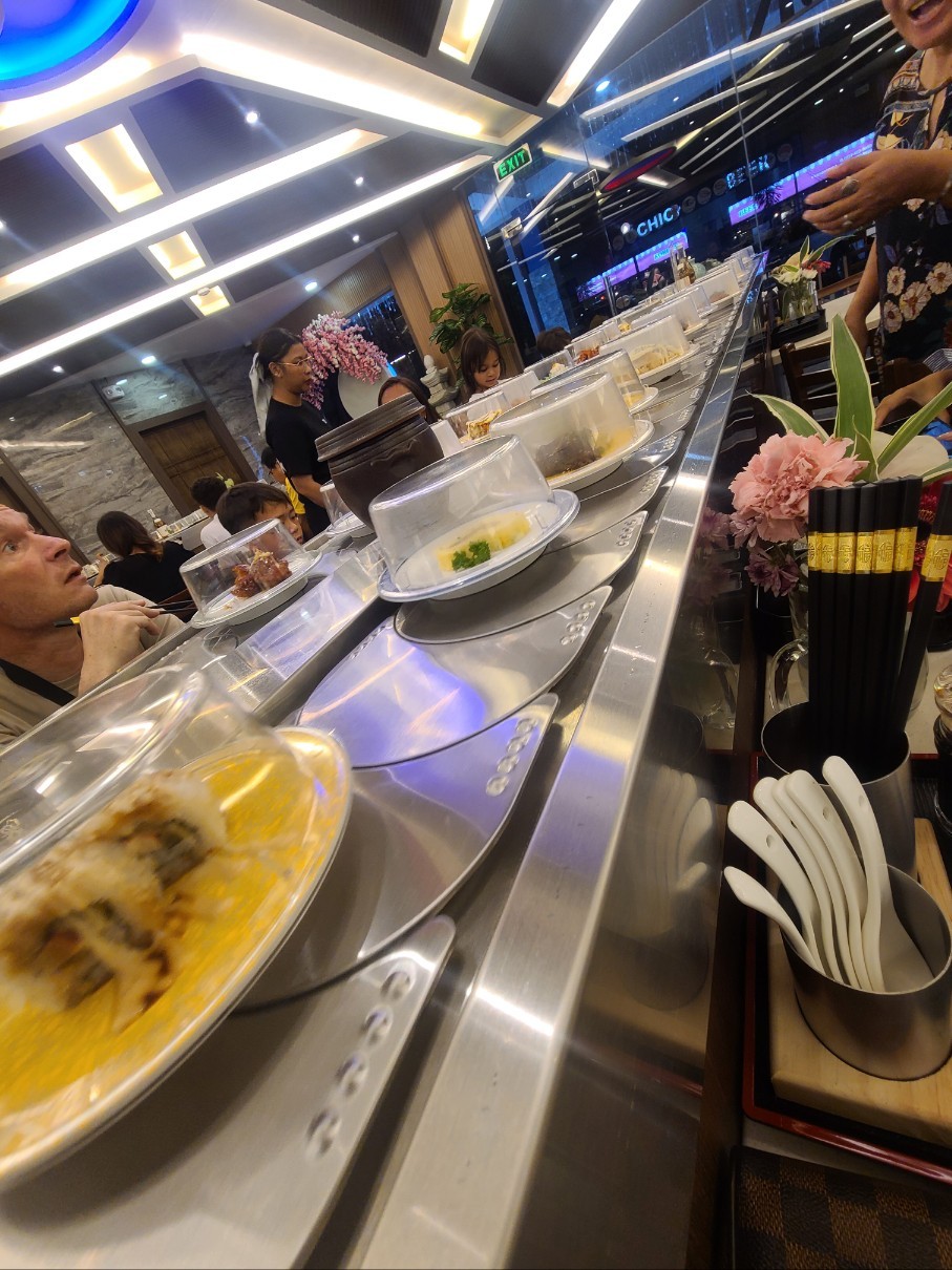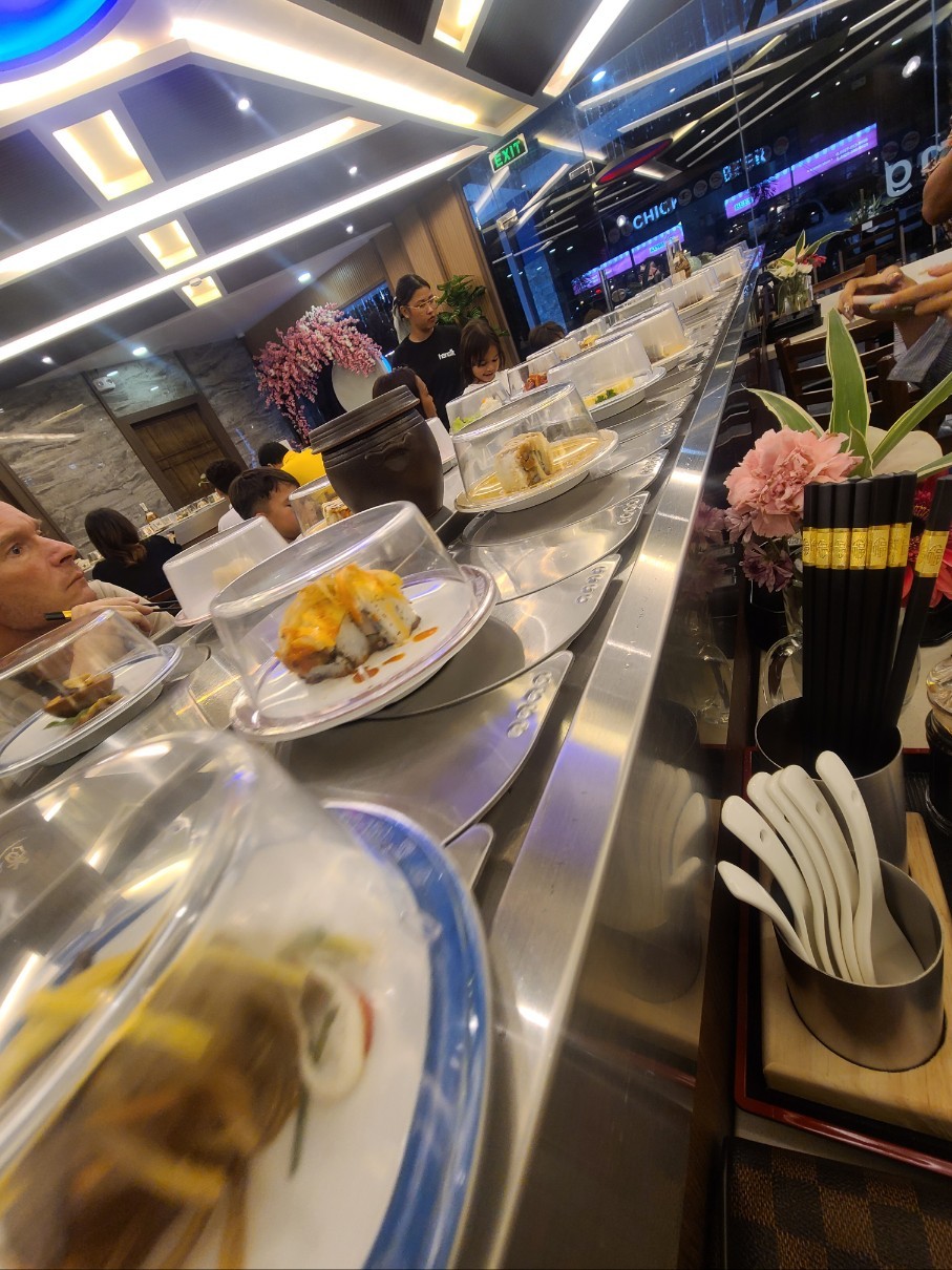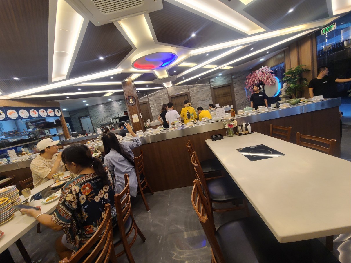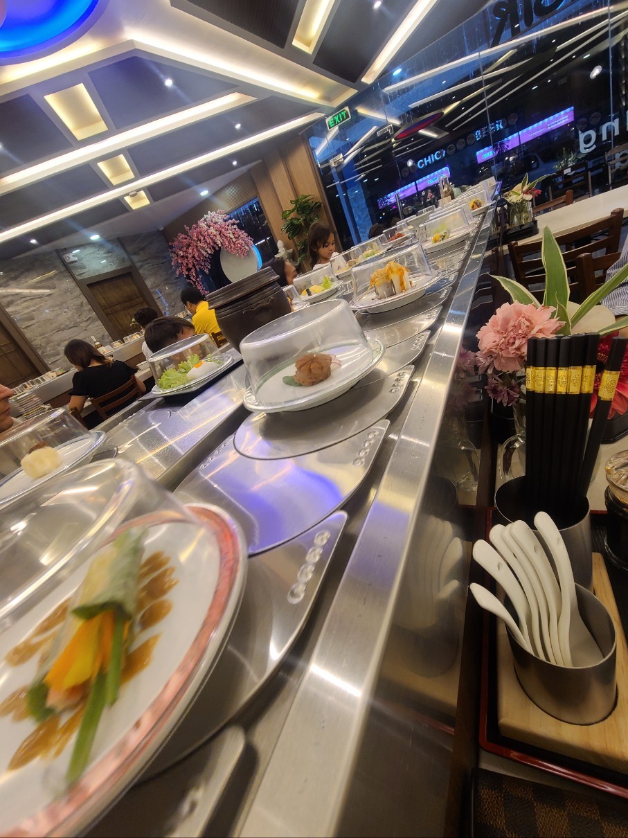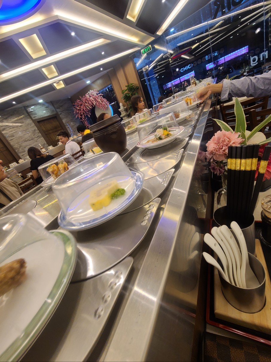 회전초밥 시스템의 컨베이어벨트 가 식당안에 돌아가고 있으며,