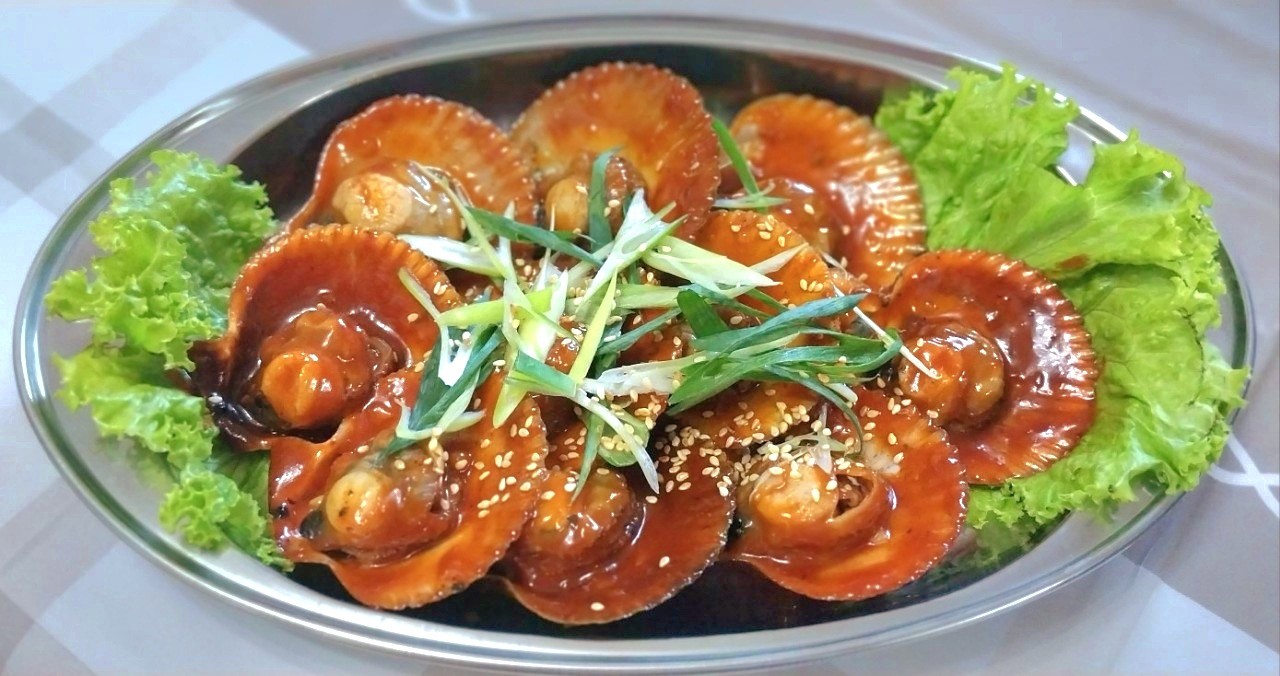 바닷가옆 원두막 안에 시푸드바베큐, 싱싱한회, 알리망호, 갑오징어 등 푸짐한 한상이 차려져 있습니다.