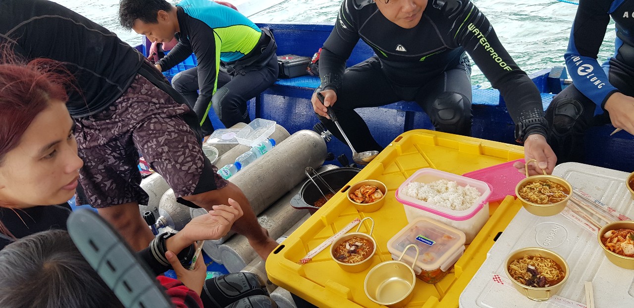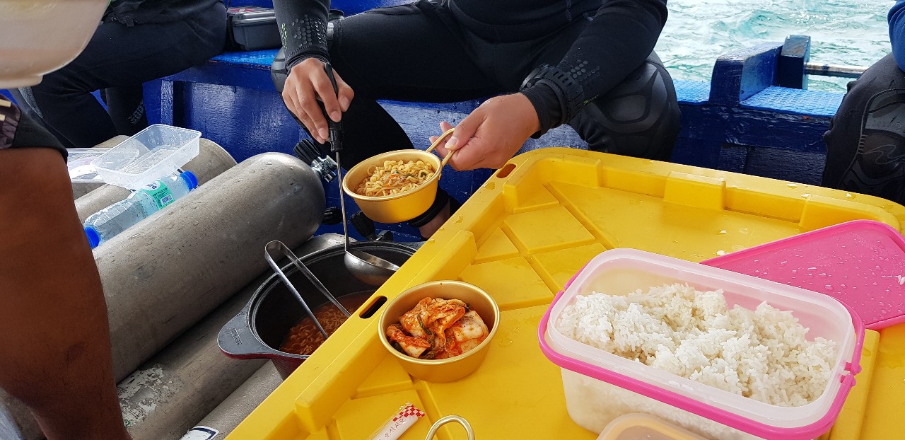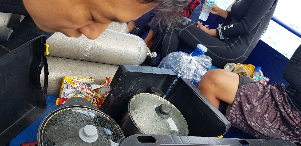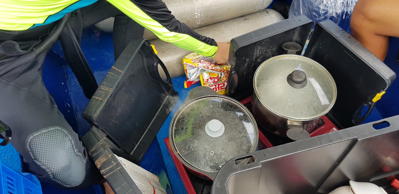 오늘은 다이빙 이 3번이 잡혀 있어서 배 위에서 문어라면 을 끓여서 점심을 때우기로 했습니다.