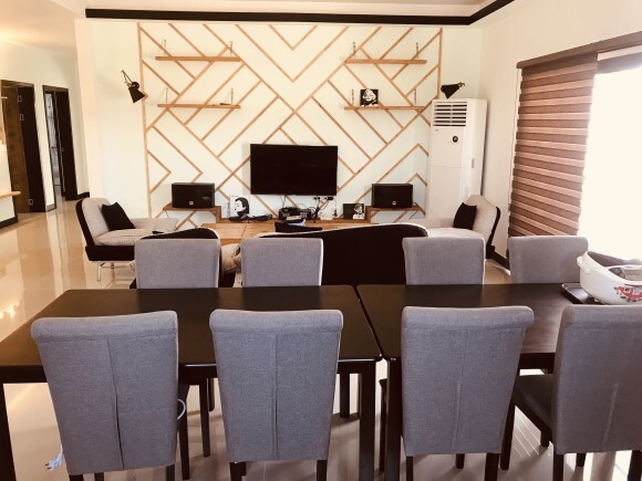 오즈 앙헬레스 풀빌라 거실에는 8인용 식탁 과 노래방 시스템이 준비되어 있습니다