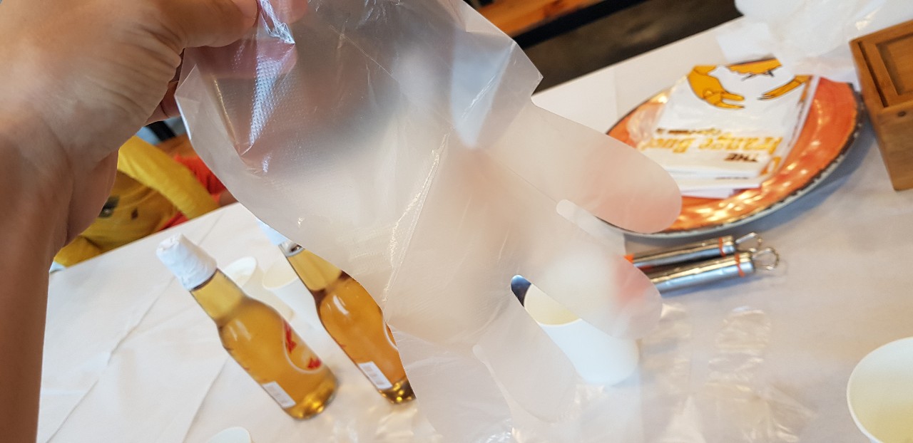그리고 무엇보다 특이한 것은 비닐장갑을 끼고 모두 손으로 먹습니다.